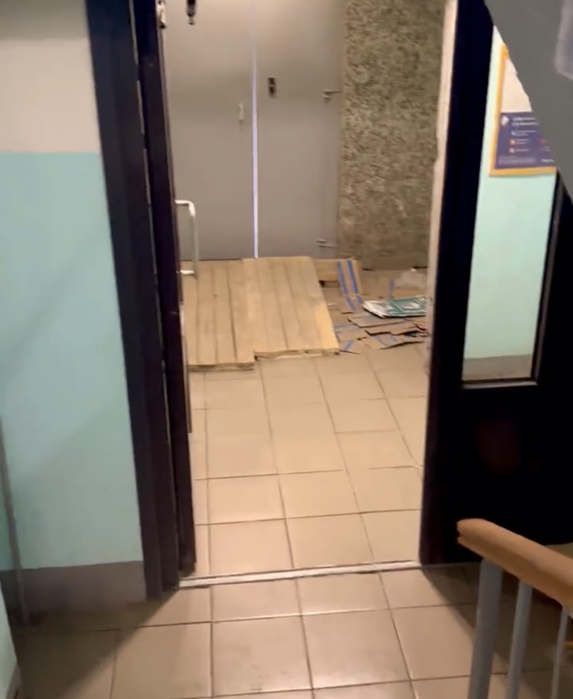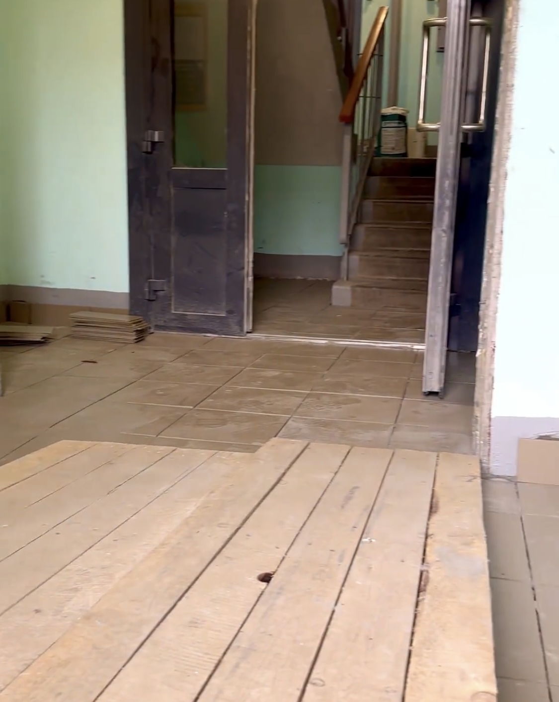 В пятом подъезде по Лососинскому шоссе 24/1 ведутся ремонтные работы по замене плитки.