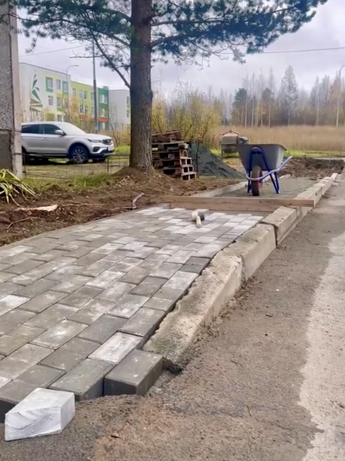 - завершилась укладка тротуарной плитки на пешеходных дорожках во дворе дома по улице Хейкконена 10, где были проведены ремонтные работы по укладке брусчатки;
