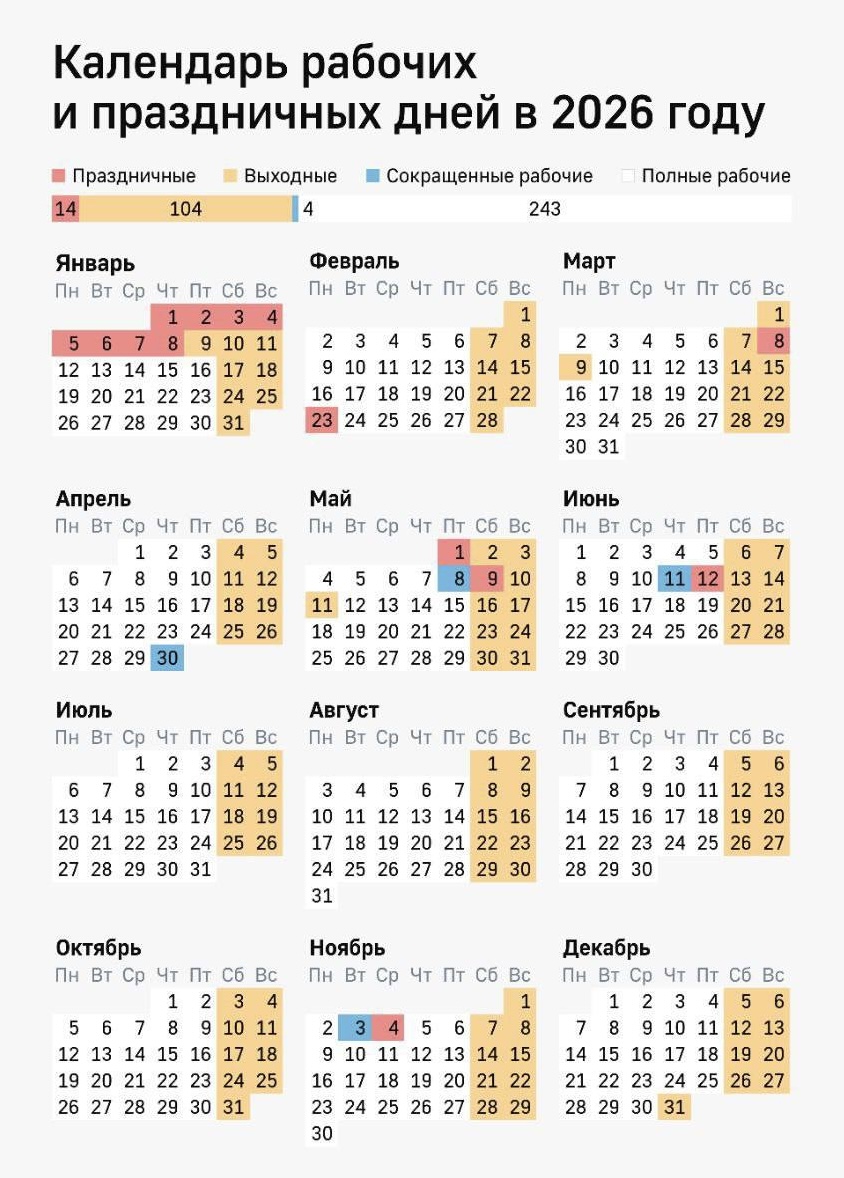 При этом в 2026 году сотрудников ожидает семь коротких рабочих недель. Такие недели, как правило, образуются перед или после государственных праздников, когда рабочий день, выпадающий на пятницу или понедельник, объявляется выходным.