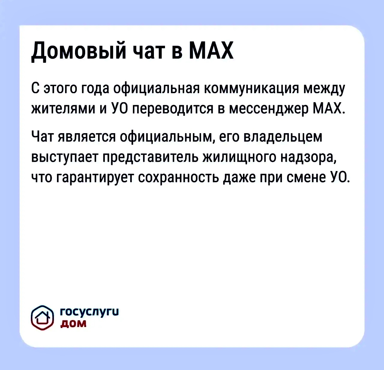В конце 2025 года Госдума приняла закон, предусматривающий ведение домовых чатов в отечественном мессенджере Max. Управляющим компаниям предписывается перенести в Max чаты и в дальнейшем именно там вести коммуникации с жителями. Порядок такого взаимодействия устанавливает Минстрой России.